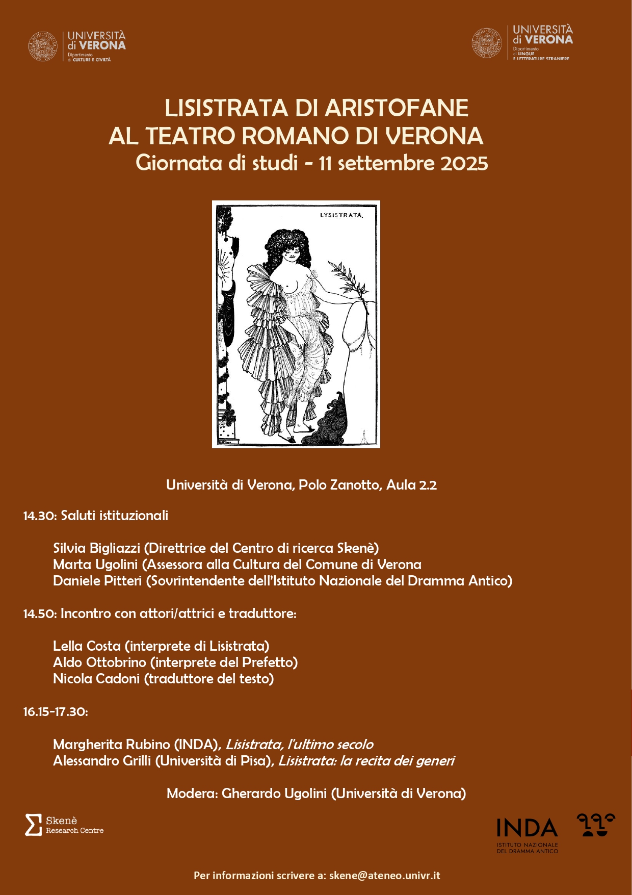 Giornata di studi sulla commedia Lisistrata di Aristofane, giovedì 11 settembre al Polo Zanotto dell'Università di Verona. L'ormai tradizionale appuntamento è organizzato dal Centro di ricerca Skenè in occasione della messa in scena del testo di Aristofane al Teatro...